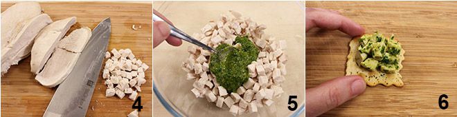 Schneiden Sie die inzwischen abgekühlte Hühnerbrust in kleine Würfel 4 und würzen Sie sie mit der grünen Soße 5, indem Sie gut mischen, um die Zutaten zu verbinden. Beenden Sie das Gericht, indem Sie einen Löffel grünen Hühnersalat auf jedes Olivenblätterteigstück geben.