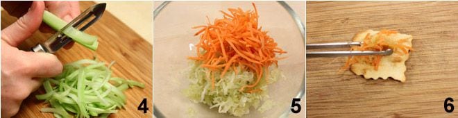 Um die klassischen Blätterteigblätter mit Oktopussalat zuzubereiten, können Sie entweder einen bereits zubereiteten Oktopussalat verwenden oder den Salat nach dem Rezept, das Sie Petersilien-Oktopus-Salat (Oktopussalat) finden, unter Verwendung eines frischen Oktopus zubereiten. Sie benötigen 100 g Oktopussalat, den restlichen Salat können Sie verwenden, um die Häppchen zu begleiten, indem Sie, wenn Sie es mögen, gekochte Kartoffeln hinzufügen. Bereiten Sie dann die Gemüse-Julienne vor: Waschen und schälen Sie die Karotten und den Sellerie 2, die den Oktopus begleiten werden: Zerkleinern Sie die Karotte und den Sellerie zur Julienne mit einer Küchenmaschine 3