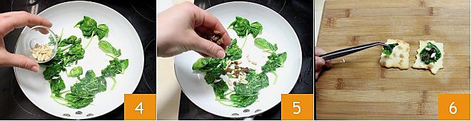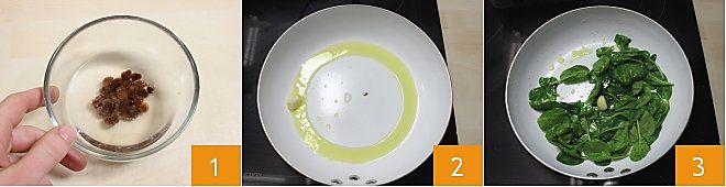 Um die klassischen Blätter mit Spinat, Rosinen und Pinienkernen zuzubereiten, beginnen Sie damit, die Rosinen einzuweichen 1. In der Zwischenzeit waschen Sie den Spinat gründlich und trocknen ihn ab. Danach nehmen Sie eine Antihaftpfanne und erhitzen Sie einen Schuss natives Olivenöl extra und eine geschälte Knoblauchzehe 2. Fügen Sie nun den Spinat hinzu und braten Sie ihn bei mittlerer Hitze schnell für 2 Minuten, bis er leicht verwelkt ist 3.