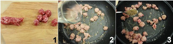 Um die Blätterteigstücke mit knuspriger Luganega und Stracchino zuzubereiten, beginnen Sie damit, die Luganega in viele kleine Würfel zu schneiden 1. Erhitzen Sie das Öl in einem kleinen Topf und braten Sie die Luganega an. Wenn sie anfängt, Farbe zu bekommen, löschen Sie mit dem Wein ab 2 und fügen Sie die Fenchelsamen hinzu 3,