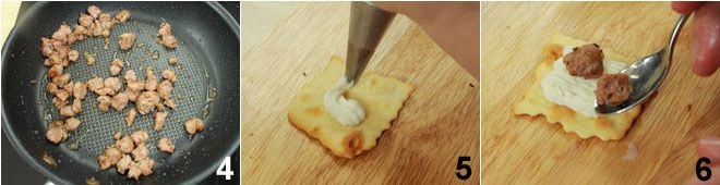 lassen Sie das Fleisch kochen, bis es schön rot und knusprig ist 4. Reduzieren Sie dann den Stracchino zu einer Creme, indem Sie einen Löffel verwenden, und füllen Sie den Käse in einen Spritzbeutel. Zum Schluss spritzen Sie die Creme auf die klassischen Blätterteige von „La Bottega di Olivia&Marino“ 5 und legen auf jedes Blätterteigstück zwei Würfel knusprige Luganega 6.