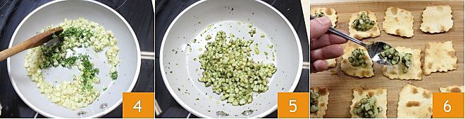 fügen Sie die gehackten Kräuter in die Pfanne 4 und mischen Sie gut, um alles zu verbinden. Lassen Sie alles bei mittlerer Hitze für 15 - 20 Minuten kochen, bis der Topinambur weich geworden ist 5. Sobald der Topinambur gekocht ist, legen Sie einen Teelöffel davon auf jedes Blätterteigstück 6 und vervollständigen Sie es mit einem Hauch schwarzen Pfeffer auf jedem Blätterteig.