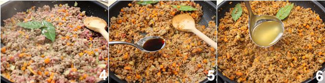 Fügen Sie auch das Lorbeerblatt und die Thymianblättchen hinzu 4. Dann geben Sie das Tomatenmark hinzu, mischen und fügen die Worcestersauce 5 und die Brühe 6 hinzu. Zum Kochen bringen und bei schwacher Hitze etwa 45 Minuten köcheln lassen, bis Sie die Konsistenz einer dicken Sauce (ähnlich Ragù) erhalten.