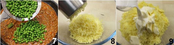 Fügen Sie die gefrorenen Erbsen hinzu 7, würzen Sie mit Salz und Pfeffer und lassen Sie kochen, bis die Erbsen zart sind. Während die Sauce kocht, bereiten Sie das Püree vor, um es zu bedecken: Kochen Sie die Kartoffeln mit Schale in gesalzenem Wasser, bis sie zart sind (etwa 30 Minuten). Schälen Sie sie und passieren Sie sie noch warm durch die Kartoffelpresse 8. Fügen Sie die warme Milch, die weiche Butter 9,