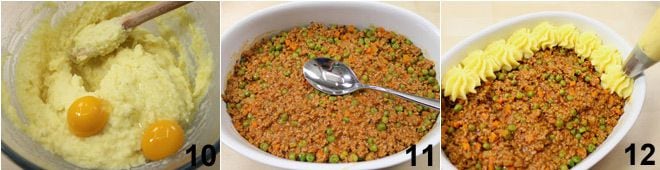 die Eigelbe 10, Salz, Pfeffer und Muskatnuss hinzu und mischen Sie die Zutaten gut. An diesem Punkt geben Sie die Fleisch- und Erbsensauce in eine Auflaufform und glätten sie mit einem Löffel 11. Dann geben Sie das Püree in einen Spritzbeutel mit gezackter Tülle und machen Sie Kartoffeltupfen über das Fleisch 12, um eine Schicht Kartoffeln zu bilden. Backen Sie den Shepherd's Pie für 30 Minuten bei 200°C. In den letzten 10 Minuten schalten Sie den Grill des Ofens ein, um die Kartoffeln goldbraun zu machen. Nehmen Sie den Auflauf aus dem Ofen und lassen Sie ihn etwa zehn Minuten ruhen, bevor Sie ihn servieren!
