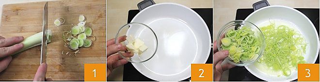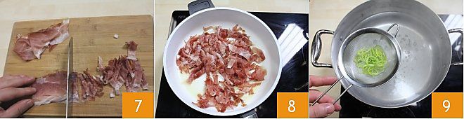 Schneiden Sie den Speck in Streifen 7 und lassen Sie ihn in der restlichen Butter für ein paar Minuten 8 anbraten, bis er knusprig wird. Bringen Sie reichlich Salzwasser zum Kochen, blanchieren Sie dann die beiseite gestellten Lauchringe für die Garnierung 9 für ein paar Sekunden, nehmen Sie sie heraus und legen Sie sie beiseite.