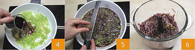 Wenn der Lauch gut weich geworden ist, fügen Sie den Chianti-Wein 4, eine Prise Muskatnuss 5 und eine Prise Salz hinzu. Lassen Sie alles bei mittlerer Hitze einige Minuten einkochen, bis der Alkohol des Weins vollständig verdampft ist. Geben Sie die Mischung dann in einen Mixer 6 und pürieren Sie alles, bis Sie eine cremige Konsistenz erhalten; salzen und pfeffern Sie nach Belieben.