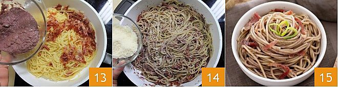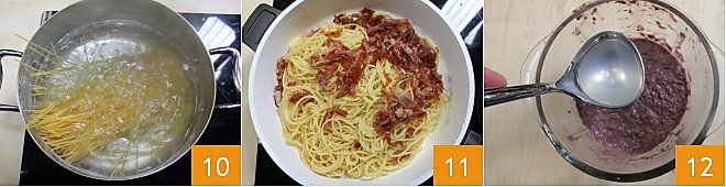 Kochen Sie in demselben Wasser die Spaghetti 10 und lassen Sie sie al dente abtropfen, wobei Sie eine Schöpfkelle des Kochwassers separat aufbewahren, und fügen Sie sie dann dem Speck hinzu 11 und lassen Sie sie zusammen für ein paar Minuten anbraten. Zur Weinsauce fügen Sie die Schöpfkelle des Kochwassers hinzu 12,