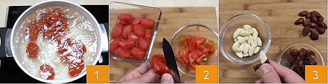 Um die Spaghetti mit Trapanese-Pesto zuzubereiten, folgen Sie dem Rezept für das Pesto alla trapanese. Bereiten Sie zuerst die geschälten Tomaten vor: Setzen Sie einen großen Topf mit Wasser auf das Feuer. Waschen Sie die Tomaten und schneiden Sie an jedem Ende ein Kreuz. Wenn das Wasser zu köcheln beginnt, blanchieren Sie die Tomaten für 2-3 Minuten 1, dann schälen Sie die Tomaten 2 und schneiden sie in Würfel. Zu diesem Zeitpunkt schälen Sie die Mandeln: Blanchieren Sie sie einige Minuten in kochendem Wasser, lassen Sie sie ab und dann reicht ein leichter Druck mit den Fingern, um die Schale zu entfernen 3.