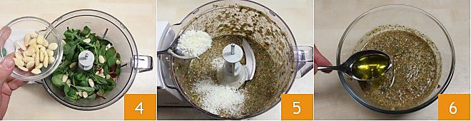 Geben Sie in einen Mixer oder besser in einen Mörser die geschälten Tomaten, das gewaschene und getrocknete Basilikumbündel, die Mandeln 4, eine Knoblauchzehe und pürieren Sie alles für ein paar Minuten. Fügen Sie den geriebenen Pecorino hinzu 5 und übertragen Sie die Mischung in eine Schüssel. Schmecken Sie mit Salz und Pfeffer ab, fügen Sie ein paar Esslöffel Öl hinzu 6, mischen Sie alles gut und geben Sie das Pesto in eine große Schüssel, in der Sie später die Spaghetti würzen werden. Sollte es zu trocken sein, fügen Sie mehr Öl hinzu.