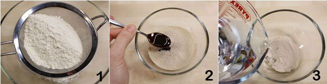 Um die Spianata Romagnola zuzubereiten, beginnen Sie damit, die beiden Mehlsorten in einer großen Schüssel zu sieben 1. Geben Sie die Hefe in eine kleine Schüssel und fügen Sie einen Teelöffel Malz (oder Zucker) 2 und etwas Wasser (aus der Gesamtmenge des Rezepts entnommen) hinzu, dann rühren Sie, bis sich die Hefe vollständig aufgelöst hat 3.