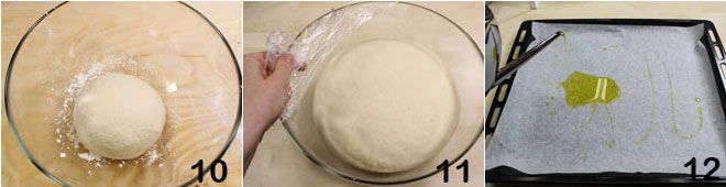 Legen Sie den erhaltenen Teig in eine mit etwas Mehl bestreute Schüssel, die Sie mit Frischhaltefolie abdecken, und lassen Sie ihn mindestens zwei Stunden im ausgeschalteten Ofen, aber mit eingeschaltetem Licht, ruhen 10. Nach der angegebenen Zeit hat der Teig sein Volumen verdoppelt 11. Nehmen Sie nun ein Backblech mit einem Blatt Backpapier und bestreichen Sie es mit 2 Esslöffeln Öl 12,