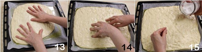 nehmen Sie dann den Teig und rollen Sie ihn mit den Händen aus 13. Drücken Sie mit den Fingerspitzen Löcher in die Spianata 14, streuen Sie dann grobes Salz (nicht zu viel) und Rosmarinnadeln auf die Oberfläche 15 und lassen Sie es 30-40 Minuten im ausgeschalteten Ofen mit eingeschaltetem Licht ruhen. Backen Sie die Spianata im vorgeheizten Ofen bei 200° für etwa 30 Minuten, bis sie gut goldbraun ist. Nehmen Sie die Spianata aus dem Ofen und legen Sie sie auf ein Gitter, um zu verhindern, dass Feuchtigkeit sie weich macht. Sobald sie lauwarm ist, schneiden Sie die Spianata Romagnola und servieren Sie sie mit Wurstwaren und Käse.