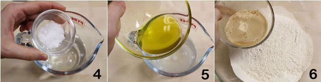 In dem verbleibenden Wasser lösen Sie das feine Salz 4 und 30 g natives Olivenöl extra 5 auf. Fügen Sie die gesiebten Mehlsorten der Hefemischung hinzu 6