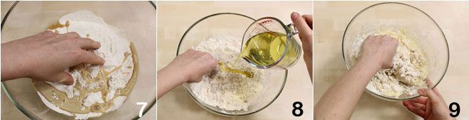 und mischen Sie es mit den Fingerspitzen ein, um es einzubeziehen 7, dann fügen Sie auch das Wasser-, Salz- und Öl-Gemisch hinzu 8 und kneten Sie alles gründlich 9. Sobald die Zutaten gut vermischt sind, bearbeiten Sie den Teig auf einem Nudelbrett mindestens 10 Minuten lang, bis Sie eine glatte und homogene Masse erhalten.