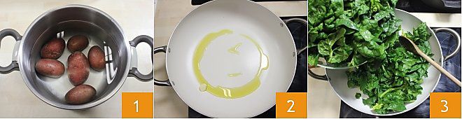 Um den Spinat-Gnoccone zuzubereiten, beginnen Sie damit, die Kartoffeln mit der Schale in reichlich Wasser 1 für etwa 20 Minuten zu kochen (oder 10 Minuten im Schnellkochtopf). In der Zwischenzeit waschen Sie den Spinat und stellen eine Pfanne mit einem Schuss Öl und der Knoblauchzehe auf den Herd 2 , lassen Sie das Öl aromatisieren (entfernen Sie den Knoblauch, wenn Sie es nicht mögen), fügen Sie den gereinigten Spinat hinzu 3 und braten Sie ihn in der Pfanne an,
