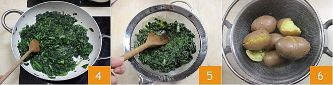 decken Sie die Pfanne mit einem Deckel ab und lassen Sie den Spinat ein paar Minuten kochen, bis er gut gegart ist 4. Lassen Sie den Spinat mit einem Sieb abtropfen 5; der Spinat muss sehr trocken sein, um zu verhindern, dass er Flüssigkeit abgibt. Salzen Sie ihn und lassen Sie ihn abkühlen. Nun kümmern Sie sich um die Kartoffeln: Sobald sie gekocht sind 6,