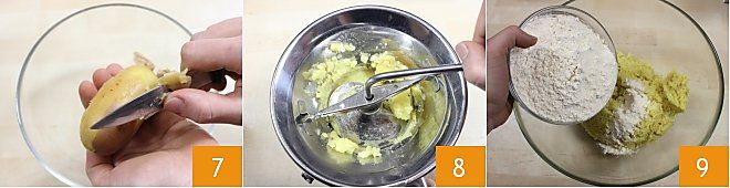 schälen Sie sie noch heiß 7 und drücken Sie sie mit einem Passiergerät 8 oder einer Kartoffelpresse in eine Schüssel. Fügen Sie das gesiebte Mehl 9, Salz und Pfeffer hinzu und