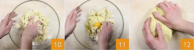 kneten Sie von Hand 10, fügen Sie das ganze Ei hinzu 11 und kneten Sie weiter, bis Sie eine leicht zu verarbeitende Masse erhalten 12. Kneten Sie schnell, während die Arbeitsfläche immer bemehlt bleibt.