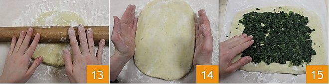 Rollen Sie mit einem Nudelholz auf einem Blatt Backpapier den Teig 13 aus, bis er eine rechteckige Form von 20 cm x 28 cm erreicht 14. Legen Sie den Spinat darauf, wobei Sie etwa 1,5 cm Abstand vom Rand lassen 15.