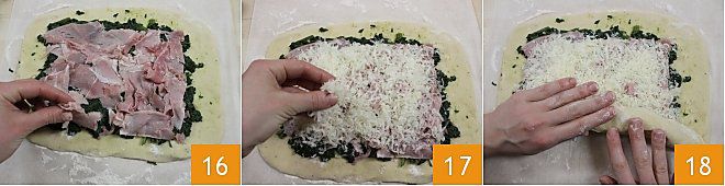 Dann legen Sie die Schinkenscheiben 16 darauf und würzen mit dem geriebenen Grana Padano 17. Jetzt falten Sie den Spinat-Gnoccone von der längeren Seite 18
