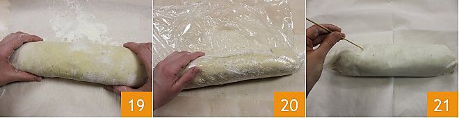und rollen ihn fest auf 19, wickeln ihn in Frischhaltefolie 20 und lassen ihn etwa 4 Stunden im Kühlschrank ruhen. Nach dieser Zeit entfernen Sie die Folie und wickeln den Spinat-Gnoccone in Backpapier, stechen Sie ihn mit einem Zahnstocher 21 ein und wickeln Sie den Gnoccone in Musselin (ein sehr leichtes Gewebe, ideal zum Kochen von Lebensmitteln)