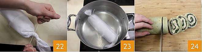 binden Sie die beiden Enden des Gewebes mit Küchengarn zusammen 22 und kochen Sie den Spinat-Gnoccone in gesalzenem kochendem Wasser etwa 30 Minuten lang 23. Wenn Sie kein Musselin haben, können Sie den Gnoccone in Alufolie wickeln und auf die gleiche Weise vorgehen. Einmal gekocht, lassen Sie den Gnoccone abkühlen, schneiden ihn in etwa 1 cm dicke Scheiben 24