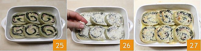und legen ihn in eine leicht geölte Auflaufform 25. Bestreuen Sie ihn mit geriebenem Grana Padano 26 und, wenn gewünscht, mit geschmolzener Butter. Lassen Sie ihn im vorgeheizten Ofen bei 200° etwa 15 Minuten gratinieren, bis die Oberfläche der Scheiben goldbraun wird. Ihr Spinat-Gnoccone ist nun bereit zum Genießen.