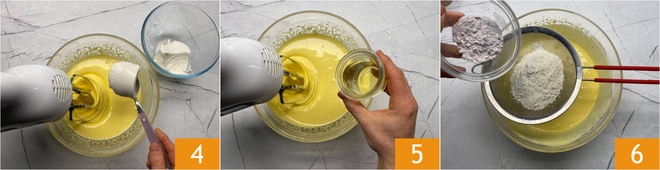 Wenn die Mischung ihr Volumen verdoppelt hat, fügen Sie die Ricotta löffelweise hinzu 4, reduzieren Sie dann die Geschwindigkeit ein wenig und geben Sie das Öl in einem dünnen Strahl hinzu 5. Schalten Sie die Rührgeräte aus und sieben Sie das Mehl und das Backpulver in die Schüssel 6.