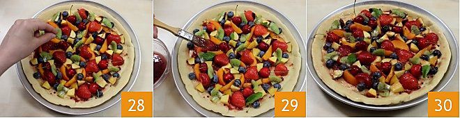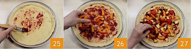 Jetzt bestreichen Sie den gesamten Boden der süßen Pizza sorgfältig mit 100 g Johannisbeerkonfitüre 25, die Sie zuvor leicht erwärmt haben, um sie flüssiger zu machen. Geben Sie dann nach und nach gleichmäßig das Obst auf die Pizza, beginnend mit den Aprikosenspalten 26, dann die Pfirsichwürfel und die Erdbeeren 27.