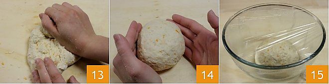 Kneten Sie kräftig mit den Händen 13, um einen glatten und weichen Teig zu erhalten, aus dem Sie eine Kugel formen 14. Legen Sie diese in eine Schüssel, bedecken Sie sie mit Frischhaltefolie und lassen Sie sie mindestens 3 Stunden bei Raumtemperatur gehen 15.