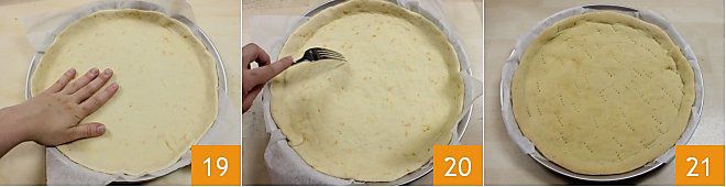 Stellen Sie sicher, dass der Boden und die Ränder perfekt an der Form anliegen 19. Stechen Sie dann den Boden mit den Zinken einer Gabel ein 20 und backen Sie ihn im vorgeheizten statischen Ofen bei 180°C für 30 Minuten (wenn Sie einen Umluftofen verwenden, bei 160°C für 20-25 Minuten). Wenn er gebacken ist, nehmen Sie ihn aus dem Ofen und lassen ihn abkühlen 21.