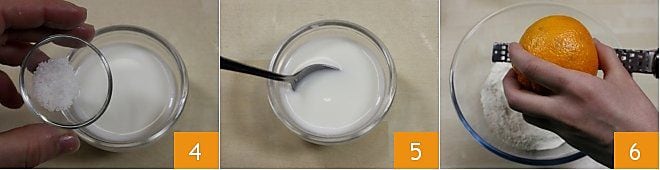 In die andere kleine Schüssel mit der anderen Hälfte der lauwarmen Milch geben Sie das Salz 4 und lösen es durch Rühren mit einem Teelöffel auf 5. In eine große Schüssel geben Sie das gesiebte Mehl und reiben die Orangenschale ab 6.