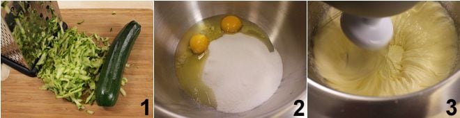 Um den süßen Zucchinikuchen zuzubereiten, beginnen Sie damit, die Zucchini zu waschen, die Enden zu entfernen und sie mit einer groben Reibe zu reiben 1; drücken Sie sie dann leicht aus, um überschüssiges Wasser zu entfernen. Schlagen Sie die ganzen Eier mit dem Zucker auf 2, bis Sie eine helle und schaumige Masse erhalten 3.