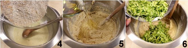 Fügen Sie dann das gesiebte 00-Mehl, Haselnussmehl (oder Mandelmehl) und Backpulver hinzu, sowie die Samen der Vanilleschote 4. Geben Sie auch das Pflanzenöl 5 hinzu, gut umrühren, um es zu vermischen, und zuletzt die geriebenen Zucchini 6.