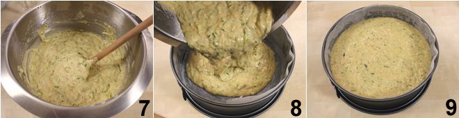 Alles vermischen 7 und die gewonnene Masse in eine 24/26 cm gebutterte und bemehlte Backform (oder mit Backpapier ausgelegt) gießen (7-8). Backen Sie den Zucchinikuchen etwa 60 Minuten lang bei 180°C (Ober-/Unterhitze), überprüfen Sie mit einem Zahnstocher, ob er durchgebacken ist, bevor Sie ihn aus dem Ofen nehmen. Sollte er nach den ersten 40 Minuten zu dunkel werden, bedecken Sie ihn mit einem Blatt Aluminiumfolie. Lassen Sie den süßen Zucchinikuchen abkühlen, bevor Sie ihn aus der Form nehmen. Servieren Sie ihn bestäubt mit Puderzucker!