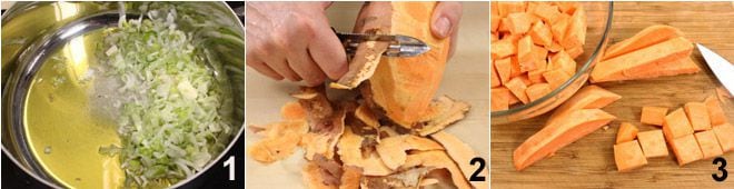 Um das Süßkartoffelpüree zuzubereiten, die Frühlingszwiebeln putzen und fein schneiden, dann bei sehr niedriger Hitze zusammen mit dem Öl und der Butter in einem Topf für mindestens 15 Minuten dünsten lassen 1. In der Zwischenzeit die Kartoffeln schälen 2 und in nicht zu große Würfel schneiden 3.