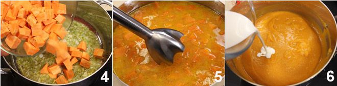 Wenn die Frühlingszwiebeln weich sind, aber keine Farbe angenommen haben, die Süßkartoffelstücke in den Topf geben 4 und dann die Gemüsebrühe hinzufügen; mit Salz abschmecken, mit einem Deckel abdecken und kochen lassen, bis sie weich werden (ca. 20 Minuten). Die Mischung mit einem Stabmixer pürieren 5, bis eine glatte, samtige Creme entsteht. Diese Süßkartoffelcreme mit der frischen Sahne 6, dem süßen Paprika und Salz abschmecken. Wenn das Püree zu dick ist, mehr Gemüsebrühe hinzufügen.