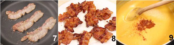 Eine beschichtete Pfanne erhitzen und wenn sie heiß ist, die Speckscheiben darauf legen 7 und auf beiden Seiten braten, dann den überschüssigen Speckfett abtropfen lassen und sie zu einer V falten, dann auf einem Teller anrichten 8. Das Püree in 4 tiefe Teller (nicht zu groß), besser 4 Schälchen, geben, mit ein paar Prisen Paprika bestreuen 9, die Speckscheibe in die Mitte legen, mit einem Schuss extra nativem Olivenöl abschließen und mit Croûtons oder gerösteten Brotscheiben servieren.