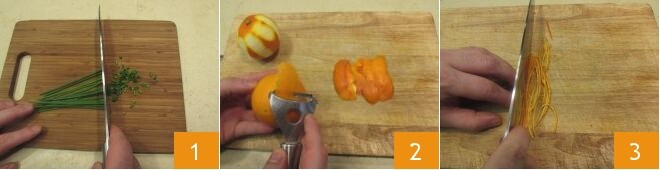 Um die Tagliatelle mit Orange zuzubereiten, beginnen Sie mit dem Hacken des Schnittlauchs und legen Sie ihn beiseite 1. Schälen Sie dann die Orangen mit einem Gemüseschäler 2, wobei Sie darauf achten, nur den äußeren Teil der Schale zu entnehmen und den bittereren weißen Teil zu vermeiden. Schneiden Sie dann die Schale einer Orange in Julienne 3, während Sie die andere ganz lassen können.