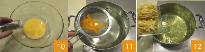 und pfeffern Sie 10. Lassen Sie die Orangenschalen abtropfen 11, dann lassen Sie das Wasser wieder aufkochen, während Sie die Pasta vorbereiten, die Sie eintauchen, sobald sie die richtige Temperatur erreicht hat. An diesem Punkt kochen Sie die Tagliatelle 3-4 Minuten oder für die auf der Packung angegebene Zeit im gleichen Wasser, in dem Sie die Schalen gekocht haben 12.