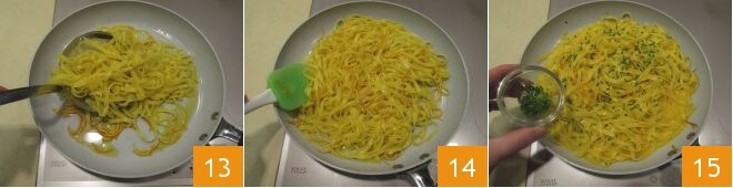 Dann lassen Sie die Tagliatelle mit einem Schaumlöffel abtropfen und geben sie direkt in die Pfanne, in der Sie die in Julienne geschnittenen Orangenschalen angebraten haben 13; mischen Sie mit einem Spatel 14 und würzen Sie mit dem Schnittlauch 15.