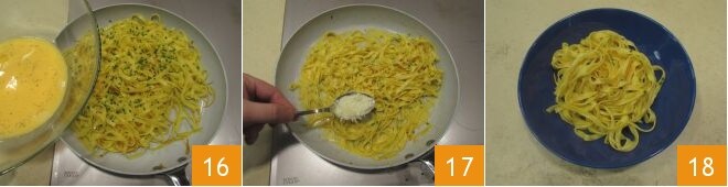 Gießen Sie dann die mit Wasser geschlagenen Eigelbe hinzu 16 und schwenken Sie sie schnell bei niedriger Hitze. Dann schalten Sie die Hitze aus, fügen den geriebenen Grana Padano DOP hinzu 17 und servieren Sie die Tagliatelle mit Orange heiß 18!