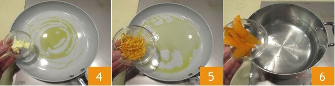 Erhitzen Sie in einer großen Pfanne das Öl mit der Butter auf sehr niedriger Flamme 4 und wenn letztere geschmolzen ist, geben Sie die in Julienne geschnittene Orangenschale hinzu 5 und lassen Sie sie unter gelegentlichem Rühren leicht bräunen; währenddessen können Sie die ganze Schale in einen Topf mit heißem Wasser tauchen 6. Lassen Sie die Schalen kochen, damit sie ihr Aroma freisetzen.