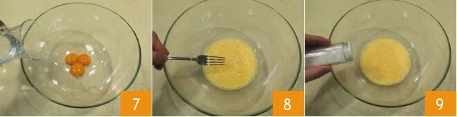 In der Zwischenzeit geben Sie in eine Schüssel die Eigelbe (sie müssen sehr frisch sein) und fügen Sie das Wasser bei Raumtemperatur hinzu 7, dann schlagen Sie sie mit einer Gabel 8; salzen Sie 9.