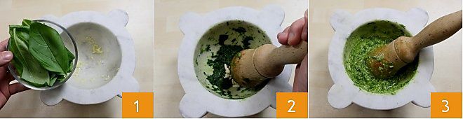 Um die Tagliatelle mit Spargel und Pesto zuzubereiten, beginnen Sie mit der Zubereitung des genuesischen Pestos; für weitere Details schauen Sie sich das Rezept des Pesto alla Genovese an). Geben Sie die Knoblauchzehe in einen Mörser (alternativ können Sie einen Mixer verwenden) und zerkleinern Sie sie, dann fügen Sie die frischen Basilikumblätter 1 zusammen mit dem groben Salz hinzu. Zerdrücken Sie den Basilikum gegen die Wände des Mörsers, indem Sie den Stößel von links nach rechts drehen und gleichzeitig den Mörser in die entgegengesetzte Richtung drehen (von rechts nach links). Wenn die Basilikumblätter eine leuchtend grüne Flüssigkeit abgeben, fügen Sie die Pinienkerne hinzu und beginnen Sie erneut zu zerstoßen 2. Fügen Sie die Käsesorten hinzu und zuletzt das extra native Olivenöl, das in einem dünnen Strahl hinzugefügt wird, während Sie immer mit dem Stößel rühren. Vermengen Sie die Zutaten gut, bis Sie eine homogene Sauce erhalten 3. Nun, da das Pesto fertig ist, stellen Sie es beiseite; wenn Sie bereits hausgemachtes Pesto haben, können Sie 120-150 g davon für dieses Rezept verwenden.