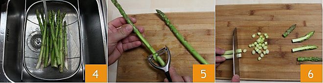 Fahren Sie nun mit der Zubereitung der Spargel fort: Waschen Sie sie gründlich unter fließendem Wasser 4. Entfernen Sie dann den härteren weißen Endteil, indem Sie die Spargel angleichen, und schälen Sie die Stange mit einem Sparschäler oder einem kleinen Messer, bis sie weiß wird, um den faserigen Teil zu entfernen 5. Schneiden Sie die Spitzen, die ganz oder halbiert für die Zubereitung verwendet werden, und schneiden Sie die Stange in Ringe 6. Für diese Schritte können Sie die Kochschule konsultieren: wie man Spargel reinigt.
