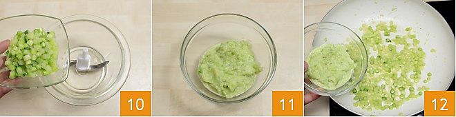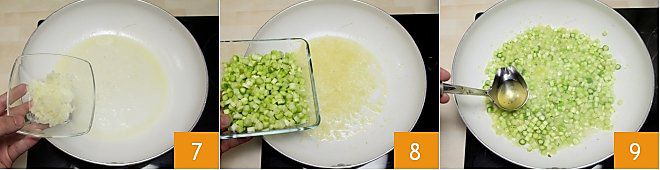 Nehmen Sie nun die Hälfte der Stangen aus der Pfanne und pürieren Sie sie in einem Mixer 10. Sie können etwas Gemüsebrühe oder heißes Wasser hinzufügen, um eine Creme zu erzeugen 11. Fügen Sie die Spargelcreme den in Stücke geschnittenen Stangen in der Pfanne hinzu 12, mischen Sie alles bei ausgeschaltetem Feuer und stellen Sie es beiseite.