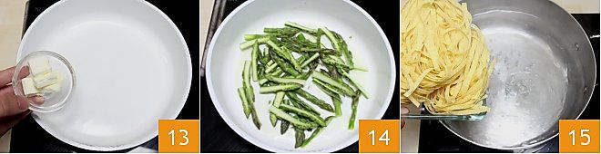 Inzwischen lassen Sie in einer anderen Pfanne bei sehr niedriger Hitze die restliche Butter schmelzen 13 und braten Sie die ganzen oder halbierten Spargelspitzen 5 Minuten lang an 14; salzen und pfeffern Sie nach Geschmack und schalten Sie das Feuer aus. Bringen Sie in einem großen Topf Wasser zum Kochen und geben Sie die Tagliatelle hinein 15. Kochen Sie die Pasta dann gemäß den auf der Verpackung angegebenen Kochzeiten.