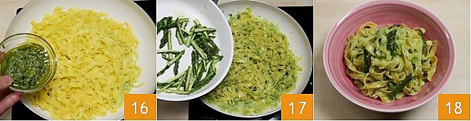 Wenn die Pasta al dente ist, lassen Sie sie abtropfen und geben Sie sie in die Pfanne, in der Sie die in Stücke geschnittenen Stangen und die Spargelcreme gemischt haben, und stellen Sie sie auf niedrige Hitze. Fügen Sie dann das Pesto hinzu 16 und zuletzt die angebratenen Spargelspitzen 17. Mischen Sie in der Pfanne für ein paar Sekunden, schalten Sie das Feuer aus und servieren Sie die Tagliatelle mit Spargel und Pesto heiß 18!
